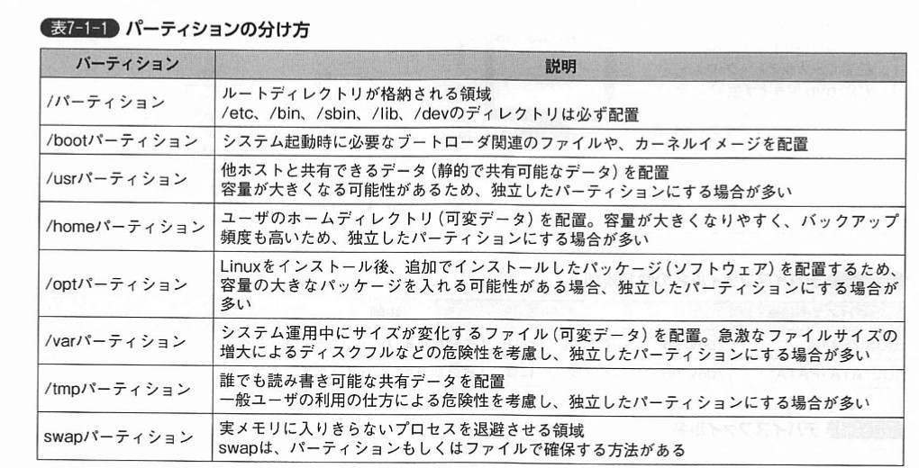 - パーティションだけではファイルを置けない、管理するためにファイルシステムがパーティション内に必要